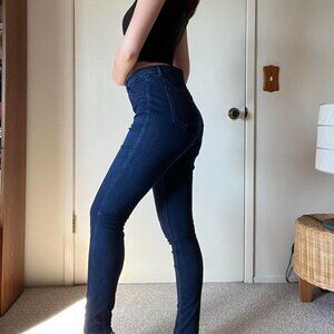 UNIQLO dark blue high waisted skinny jeggings, marked size medium and 28-29” waist and hip 34-35”. Has a fake button and zipper. Material has some stretch to it
