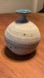 This unique ceramic piece of art (sculpture?) with a sandy textured body has a surprise opening lid. Look seamless when closed. Inside bottom and the top knob is crackled blue glass. When closed, you cannot see the opening lines. Amazing craftsmanship! Bottom is signed by the artist, but I cannot make out the name. Size is approximately 3.75” tall with diameter of 3.125”.