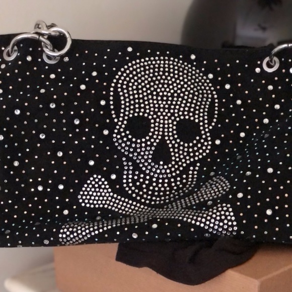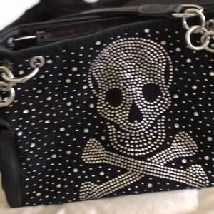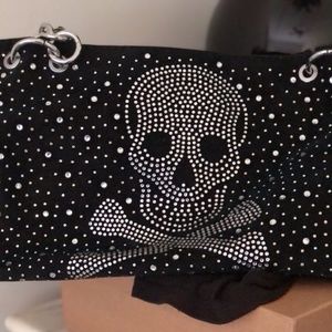 UNIQUE BLACK LEATHER HANDBAG WITH SKULL & RHINESTONES & STUDS