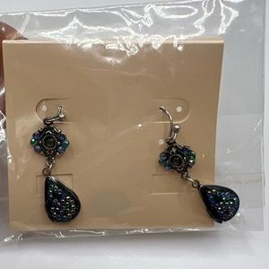 Silver toned earrings with blue and green crystals on the top half of the earring. The teardrop shaped pendant part of the earrings, are really lockets!! The front of each teardrop part of the earring has brilliant iridescent blue crystals. Shepard hook backs. These earrings are new in packaging- taken out to photograph. Extremely unique set of earrings!!