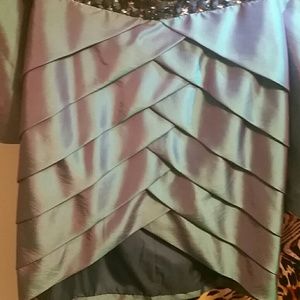 This was one of my crazier purchases :-). This is an AMAZING formal dress. It is a iridescent teal color. Animal print at the bust; gemstones underneath. It has a detachable long skirt that attaches at the back of the dress. It is very long and trails behind.You can wear the long skirt or take it off and wear it as a short dress. The dress is new with tags I never wore it. It comes with a matching stole.