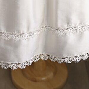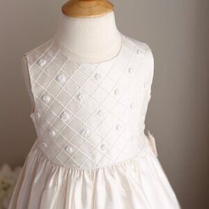 This 100% Dupioni Silk done in Ivory is STUNNIG!! The simple lines on top keep all focus on the unique details of the dress. The bodice has a full lattice design done in pin-tucks. That alone is beautiful, but even more so are the White satin fabric roses hand-sewn throughout the lattice work. A matching silk piping separates the bodice from the skirt. The bottom of the tea-length skirt has two rows of Ivory embroidered scalloped lace, separated by a row of Ivory Silk. A liner has a tier of crinoline to add the perfect amount of volume. A matching silk tie-back sash ties into a beautiful bow in back for a perfect fit. Upper button back is done in matching Ivory silk covered buttons (a high-end feature) The dress is done the sought after Brand Hartstrings. Beautiful for portraits. Would make an absolute gorgeous Flower Girl Dress. great for Special Occasions. Beautiful and Elegant!! Size 3T is NWOT and size 4 is New with Tag!