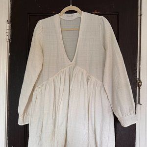 Part of a sample that was never produced this is a one of a kind Maison Cleo dress. Super cute but I never wear it so looking to find it a new home. Fits a size small. Has a small stain on the back bottom of the dress that is in the ruffles so not at all noticeable when wearing it. In otherwise perfect condition, literally worn 1-2 times since purchased in 2019 direct from the brand on Instagram. Have added two pictures of the dress in the material/color-way it is being sold to show the shape. Actual dress is white, different material, and not see-through.