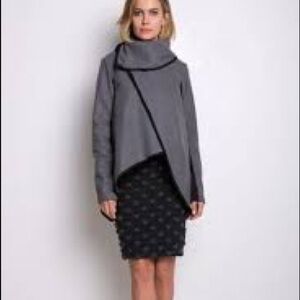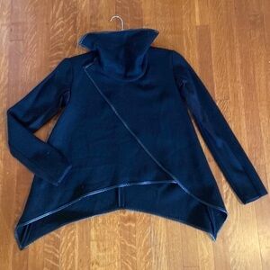 Incredibly unique jacket/coat. Black with a faux leather trim. Can be worn multiple ways. Multiple attachment points. Can wear open, as funnel neck or roll neck. Very fitted jacket with asymmetric layers at the front. Size S.