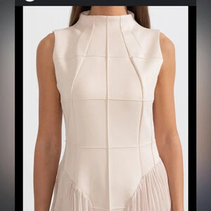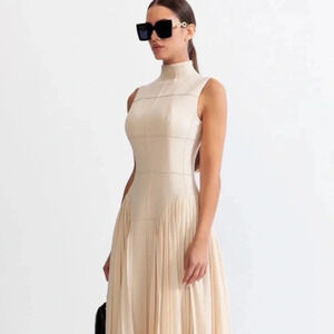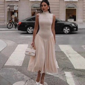 Made with a soft, slim-fit knit and delicate plies, this sleeveless dress is expertly tailored for a flattering silhouette. Its timeless nude hue exudes elegance, making it a versatile and classic piece for any occasion.