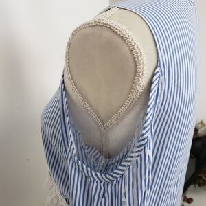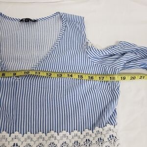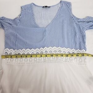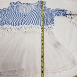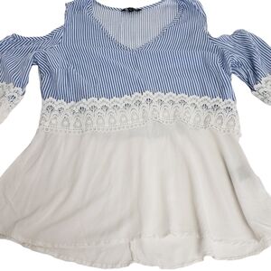 Cute Boho Cold Shoulder Top in Blue and White Stripe with Bell Sleeve and lace accent