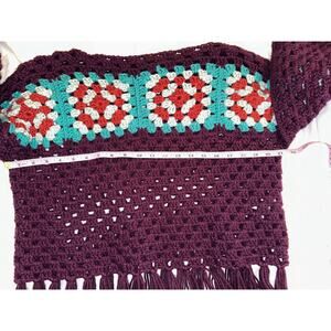 INCREDIBLE CROCHETED AND FRINGED SWEATER WITH GRANNY SQUARE MOTIF. GORGEOUS COLORS OF PURPLE, TURQUOISE AND RED! NO LABELS AS IS PROBABLY HANDMADE, BUT MEASUREMENTS ARE IN PHOTOS. EXCELLENT CONDITION.