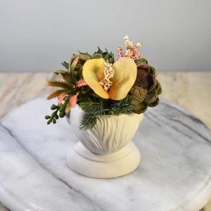 Planter is aprox 5 1/2 inches high and 5 inches wide with arrangement.