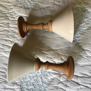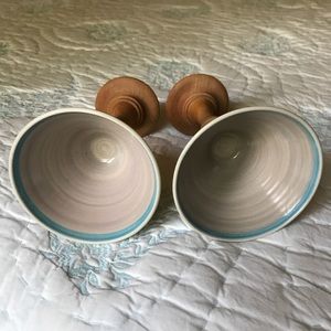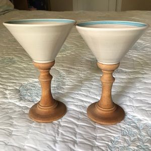 🎁 Great gift idea for the ceramics aficionado! A pair of unique, OOAK handmade ceramic martini vessels with turned wood handles. Capacity is approximately 6oz. As they are handmade, one bowl is slightly shorter than the other (see second picture). Some staining on foot of one of them.