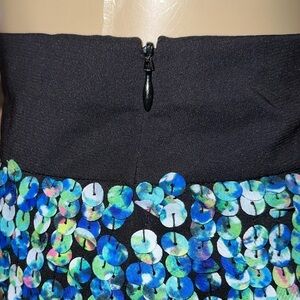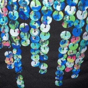 Skirt is fully lined. Sheer top layer comprised of tiny, multicolored fabric dots strung together to create this unique waterfall pattern. Light weight with a Side zipper