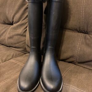 One thing that makes these great boots unique is they are “unbranded”. Can’t explain it, but there is no name or logo. They are knee high and are rubber. They have a removable sock with faux fur that spills over the top. They lace up the back. Size 7