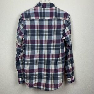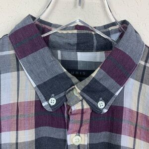 Sheer, lightweight plaid button down shirt by UNIS. Grey, purple, white, and pale yellow are a gorgeous color combination. Cuff has two button options for better sizing. Pre-owned, excellent condition.