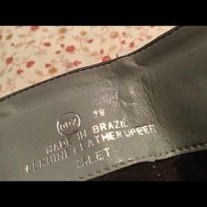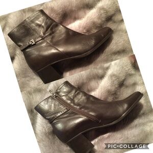 Dark brown leather ankle boots with narrow strap and buckle embellishment on side. Side zipper. Heel height 2 inches. Excellent condition.