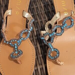 UNISA Rhinestone Cork Wedge Sandals 8 Tan Turquoise Flip Flop Beach Glam Resort