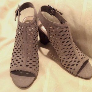 UNISA tan suede leather mesh peep-toe sandals 3" block heels NWOT Size 7