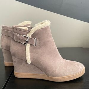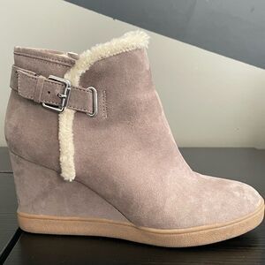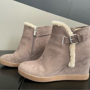 UNISA MOBII WEDGE BOOTIE. Tan with cream. EXPRESS YOUR STYLE WITH THE MOBII WEDGE BOOTIE FROM UNISA. THIS SILHOUETTE FEATURES A FAUX FUR TRIM AND BUCKLE EMBELLISHMENT THAT WILL GIVE YOUR ENSEMBLE EXTRA INTRIGUE! FAUX SUEDE UPPER. INSIDE ZIPPER CLOSURE. ROUND TOE. SYNTHETIC LINING. 3" HIDDEN WEDGE HEEL. RUBBER SOLE. WORN MAYBE TWICE! SIZE 9. EUC