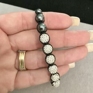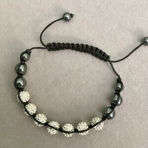 These adjustable 6”-9”Shamballa bracelets features a round black bead with color rhinestones, making it a stylish accessory for those who appreciate hip hop culture and love-themed jewelry. The beaded bracelet is made of gemstones, nylon, and other materials, with an adjustable length for a comfortable and personalized fit. Perfect for adding a touch of flair to any outfit, this pre-loved piece offers a unique and eye-catching design that is sure to make a statement.