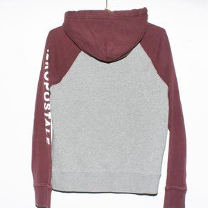 Burgundy and gray hoodie in excellent condition. No rips, holes, or tears. Closure strings are nice and white with the metal tips shiny and intact.