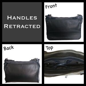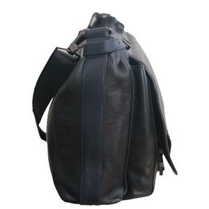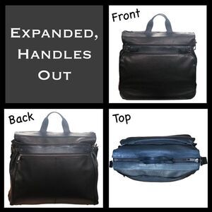 Travel just got easier. This essential briefcase / attaché / computer / overnight bag means business for the everyday professional on the go. Made of black and navy full-grain leather, gunmetal-tone hardware, & fully-lined in black-pinstripe ripstop nylon, this messenger briefcase has 3 spacious compartments: 1) a front gusseted pocket secured with 2 side-release buckles that are hidden by a flapover closure; 2) an expandable, main zip compartment, which includes a padded foam compartment with velcro strap to hold screens up to 17” & an internal zip compartment; & (3) a rear, exterior zip pocket. Featuring an adjustable & detachable easy swivel padded shoulder strap, double harness buckle accents, wallet/keychain tether, & 4 flat round metal feet measuring 1/8” x 7/16”. Bonus: detachable matching wallet.