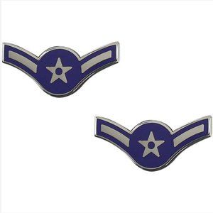 United States Air Force uniform regulations call for the wear of the Airman metal rank insignia with a variety of garments. The E-2 Airman Chevron is regulation, full size, blue and silver plated chevron. Chevrons sold in pairs (2 per order).