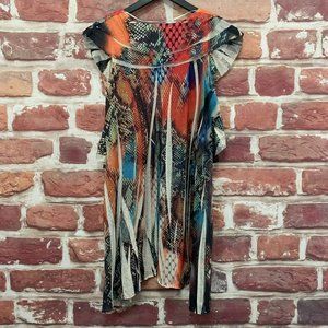 ▪️Women’s top. Scoop neckline, pullover, abstract pattern, stretchy, asymmetric hemline, oversized fit, and short flutter sleeves. Pre-owned. Wear it with your favorite pants or as a swimsuit coverup!