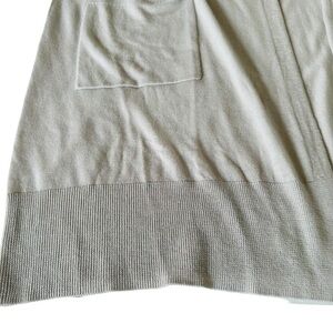 Universal Standard cardigan. Add a pretty and polished finishing touch to your look and get a bit of extra coverage with this open-front, knee-length cardigan. Features open front, long sleeves, two functional patch pockets at hip, knee length with a relaxed fit; generously cut with maximum wearing ease. In a very light grey. Made from 35% viscose/25% wool/20% nylon/20% polyester blend.