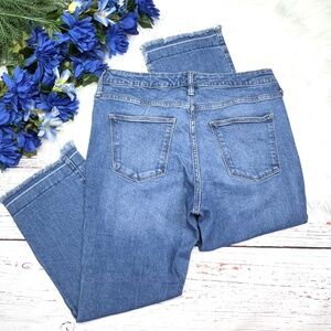 Super cute Ankle Bootcut jeans. Raw hems with the look of having been folded. Size 12/31R. Approx measurements in inches when laid flat: waist 16 across, inseam/length 24, front rise 10.5. 70% cotton, 28% lyocell, 2% elastane for tons of stretch.