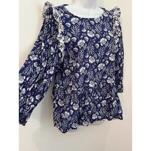 The Universal Thread Boho Blue and white Cottagecore Blouse features a ruffled shoulder and 3/4 puff sleeves, making it a stylish choice for casual occasions. Made from a blend of rayon and cotton, this floral patterned blouse has a relaxed fit and a round neck with a button closure. The blue color and bohemian theme make it a versatile option for summer, fall, and spring, while the shorter sleeves and ruffled shoulder adds a touch of femininity to the design. Easy to care for with machine washable instructions, this blouse by Universal Thread is a must-have for any woman's wardrobe. Blouse is in great Preowned condition with no obvious flaws stains or holes. Measurements in photos. I appreciate your business and strive for a five star rating. Please feel free to message with questions.