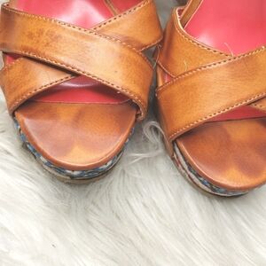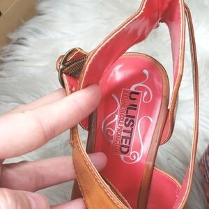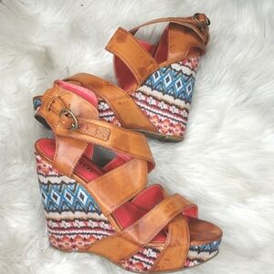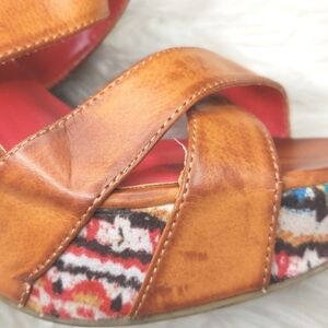 Golden or toasted brown straps on a patterned heel.