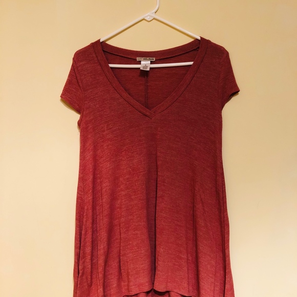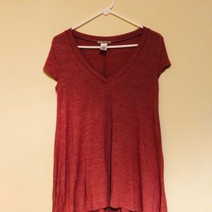 Burnt orange short sleeve T w/ asymmetrical bottom.