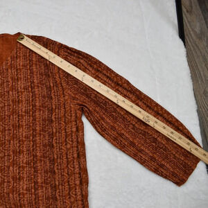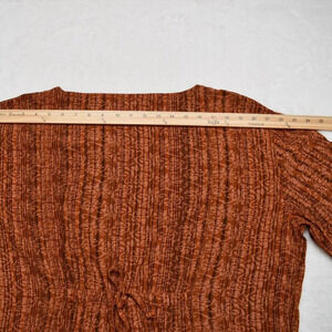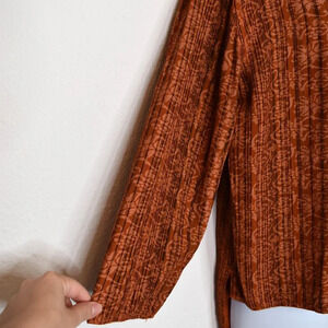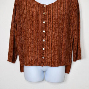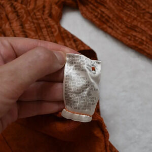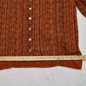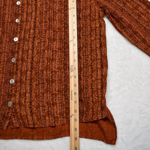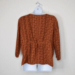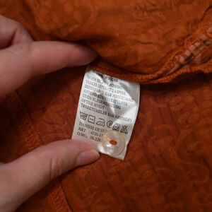 Pre-owned, good condition. No visible holes or stains. Normal signs of wear. Unique floral paisley pattern with pinstripes in shades of pale orange and brown over a rust orange background. Round neckline. 3/4 sleeves. Button front w/ mother of pearl buttons. Adjustable drawstring back with tie. High-low hemline. Side slits. Size per tag: One Size (O/S). Fabric: 100% Viscose. Danish design. Size per tag does not guarantee desired fit, please see pictures for measurements.