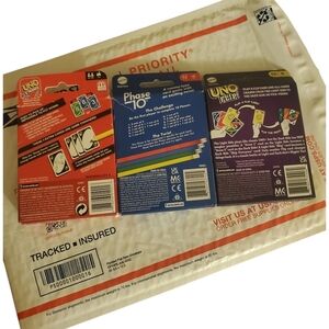UNO was opened, cards are in excellent condition. uno and phase 10 (sealed shrink wrapped cards inside) small rip on container. phase 10 and uno flip! cards in shrink wrap sealed.