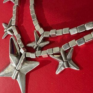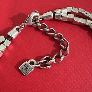 UNO de 50 silver necklace with adjustable length 17" - 20", unique butterfly wings and square beaded; center larger wings holds stunning Swarovski purple/yellow flash crystal. Includes certificate of authenticity and signature red bag.