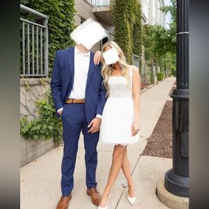 Elegant white lace mini dress from Untamed Petals. I wore this dress 1 time for my rehearsal dinner for about 3 hours. Dress has been dry cleaned. No stains, like new. Features delicate lace overlay. Perfect for any bridal occasion! Comes with original Untamed Petals cloth dress bag. Size 2. I’m a 25 waist for reference and it fit like a glove.