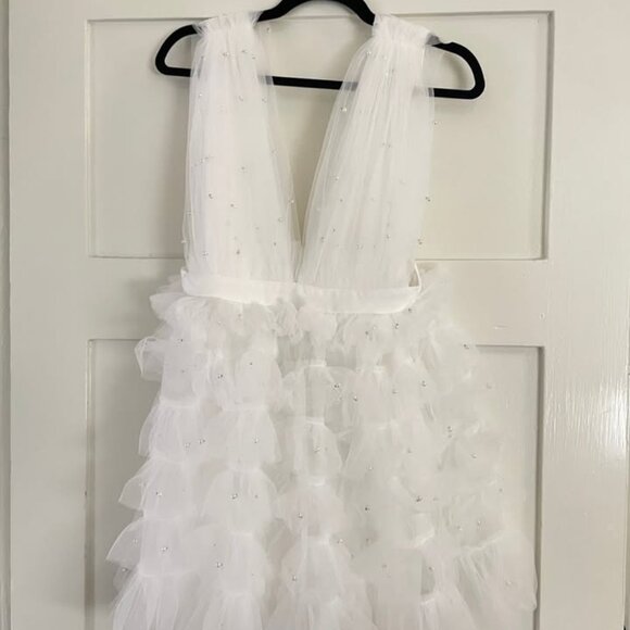 BRAND NEW untamed petals dress. White mini dress with ruffles and pearl beading. Bought for my bachelorette but don't love the way it looks on me and I can't return it because it was from their sample sale.
