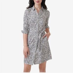 Stay effortlessly chic with this UNTUCKit women's shirt dress, featuring a playful yet elegant black-and-white floral print. This versatile dress is designed with a flattering A-line silhouette, a self-tie belt to accentuate the waist, and convenient side pockets for added functionality. The classic button-down front and collared neckline give it a polished touch, while the 3/4-length sleeves can be rolled for a casual look. Perfect for both workdays and weekend outings, this dress combines comfort, style, and timeless charm.