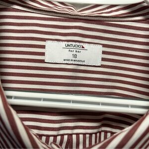 This UNTUCKit button-down shirt features a striking red-brown and white vertical stripe pattern, perfect for adding a touch of sophistication to any outfit. Crafted for a relaxed fit, it offers both comfort and style, making it an ideal choice for various occasions.