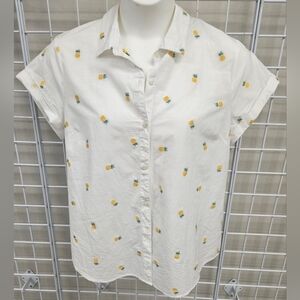 This women's short-sleeve button-up shirt is a breezy and stylish option for summer. It features a relaxed fit, making it comfortable to wear all day long. The shirt is adorned with a playful pineapple print, adding a touch of tropical fun to your wardrobe. The classic button-up closure allows you to adjust the neckline to your liking.