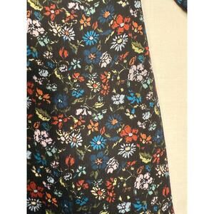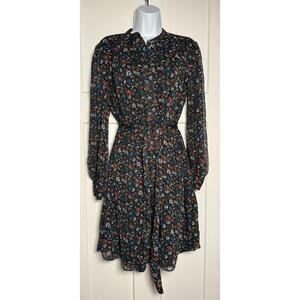 This women's size 8 dress features a beautiful black floral pattern and a flattering tie waist and sheer long sleeves.