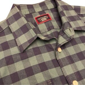 Untuckit Shirt Navy Blue & Green Vigouroux Slim-Fit WF (wrinkle free) Plaid Check Flannel Button Down, Men’s Size Medium ~ Great overall condition. (Missing one button from inner cuff that could be replaced with one of the additional buttons that are attached to fabric/content label (see photo).