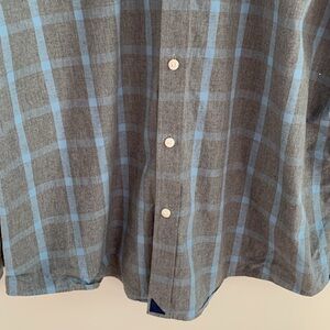 UNTUCKit plaid casual button up shirt in grey and light blue. Size XXL. Approximate measurements: pit to pit 25”, length 29”.