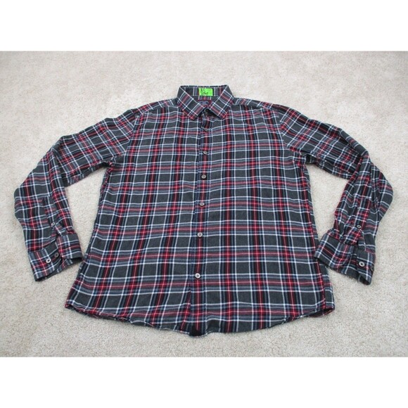 Up for sale is a - UNTUCKit Shirt Men Large Slim Fit Gray Red Holmberg Plaid Flannel Button Up *