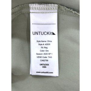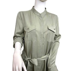 0969A- UNTUCKit for her USA , 8, made in Thailand, sage green.1.25” band collar, 2 chest pockets with triangular, fold over flaps, button, closure, pleated; matching tie belt 2”, thread belt loops on sides of waist. Above Knee. Full button closure hidden behind placket. Roll tab sleeves can be worn short 3/4 length or long with 1-button cuff. Side slit vertical pockets at hips sides.