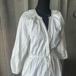 This casual white dress from UNTUCKit showcases a stylish wrap design with a tie front and elegant bishop sleeves. The plunge neckline adds a sophisticated touch, while the lightweight fabric ensures comfort for everyday wear.