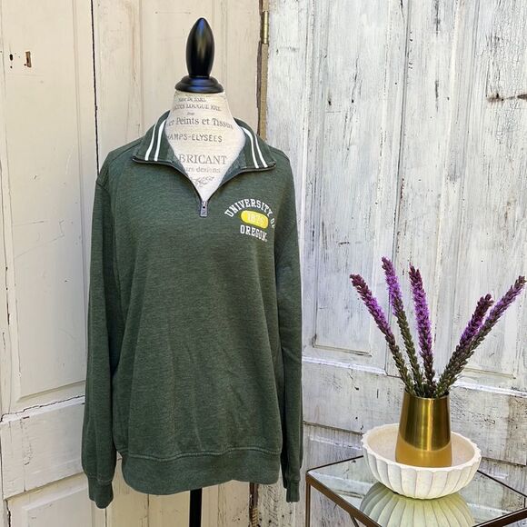 A pre-loved official university of Oregon Green sweatshirt, perfect for the fall and lazy weekends. Cowl neck with zipper fastening, long sleeves and the signature University emblem.