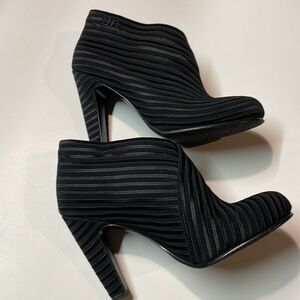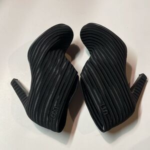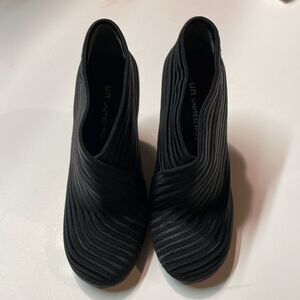 United Nude women’s black ankle bodies. Excellentused condition. No flaws. The Fold Hi is a stylish high heeled ankle booties with a platform sole. Rounded toe. Normal fit. Heel height 3.9 inches. Elastic and nylon knit fabric upper. Microfiber lining. fabric wrapped ABS heel. Rubber Sole. Smoke free home. 24 hour shipping. Open to reasonable offers.