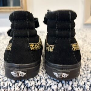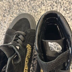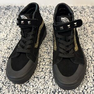 These uniquely designed Vans Old School high tops were an unused spare pair in a film shoot. heck out the awesome studded velcro ankle strap and leopard-skin print of the trademark Vans stripe.