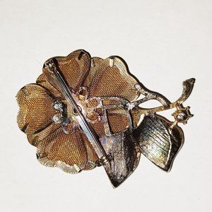 This very impressive brooch features a floral design with a flashy aurora borealis rhinestone in the center and another at the bottom of the leaves. the green edges are camera glare. the brooch itself is silver