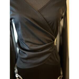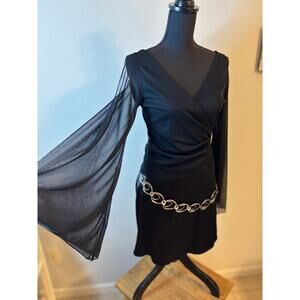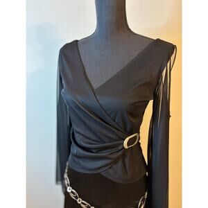 The top is a black, long-sleeved garment featuring a V-neckline and a wrap-style front. It has sheer, flowing bell sleeves made of a lightweight mesh or chiffon, fabric. The waist is cinched with a silver-toned oval buckle detail, and the main body of the top is a solid, opaque fabric.