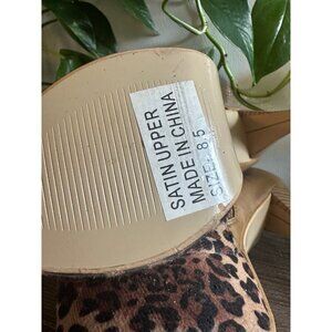 Fierce and bold platform heels by UNsensored featuring a leopard satin upper, tan faux leather accents, and gold buckle detail. Size 8.5 with ultra-high stiletto heels—perfect for a night out or standout costume look.